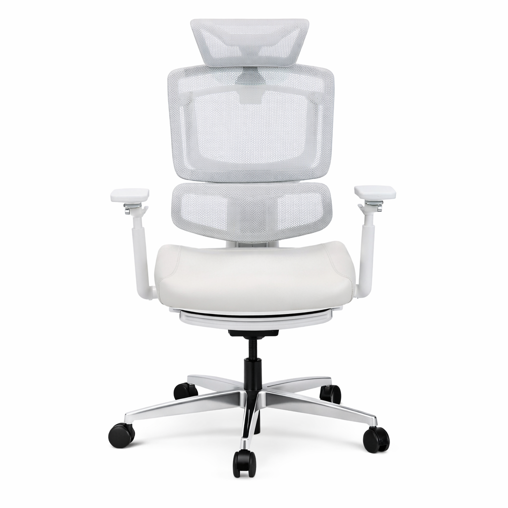 Bianco GU task chair featuring a white mesh headrest with a space‑grey frame, mesh backrest, and grey fabric foam seat. Includes space‑grey 5D adjustable arms, a paddle mechanism with grey paddle, a Class IV gas lift, and a polished aluminum base with grey PU castors.