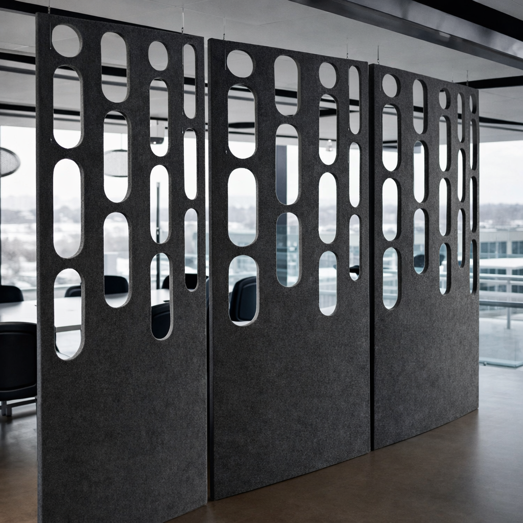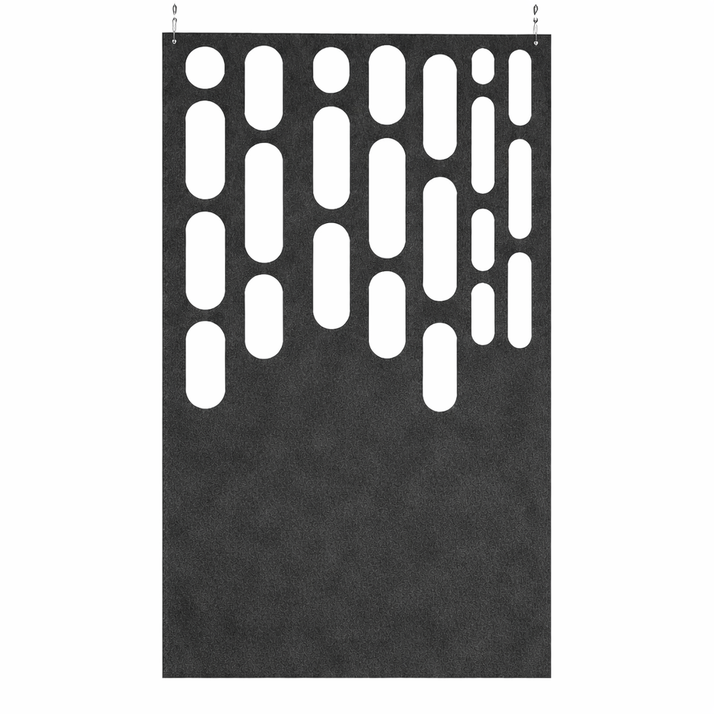 The Cascade Panel is a suspended architectural screen defined by a flowing arrangement of rounded cut-outs that create a soft, vertical rhythm. The pattern balances openness and privacy, allowing light and visual connection while gently dividing space. Suspended with discreet cable hardware, the panel delivers a modern, lightweight solution for spatial zoning in contemporary commercial and hospitality interiors.