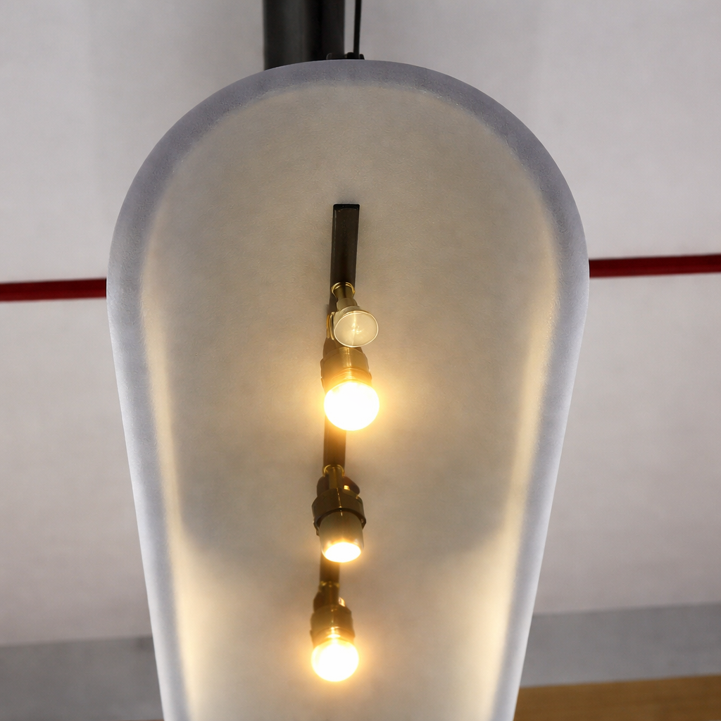 This elegant LED pendant fixture is crafted from molded acoustic light felt ceiling panels, precision-shaped into a smooth, sculptural form and wrapped in soft pink acoustic fabric. The curved shell not only houses three spherical LED bulbs that cast a warm, ambient glow — it also functions as a sound-absorbing canopy, reducing reverberation and enhancing acoustic comfort in busy interiors.