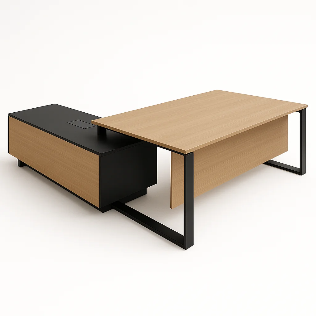 This modern executive L-shaped desk features a spacious wooden worktop with clean lines and a sleek black metal frame. Attached to the side is a low-profile storage credenza in matching wood and black finish, providing ample space for organization and built-in cable management. The combination of natural tones and industrial accents makes it a stylish and functional centerpiece for any executive office.