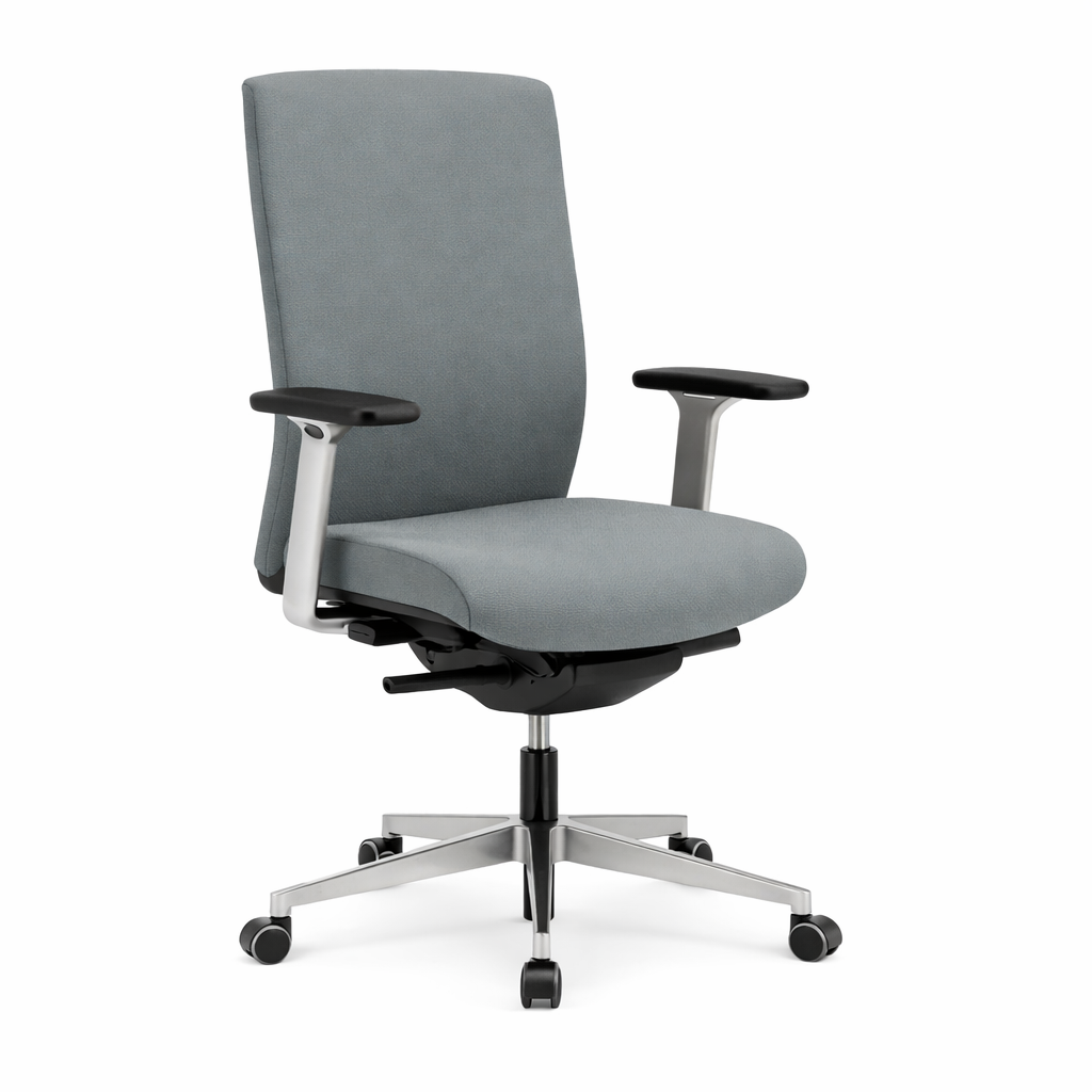 Kudos A‑H1 with upholstered back, adjustable and sliding seat, aluminum adjustable arms, multi‑lock mechanism, and an aluminum five‑star base with castors.