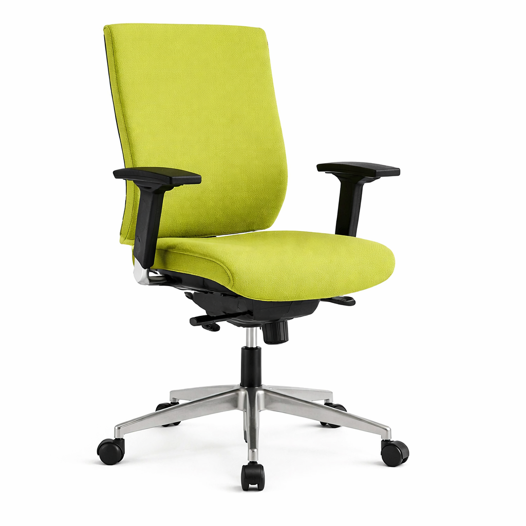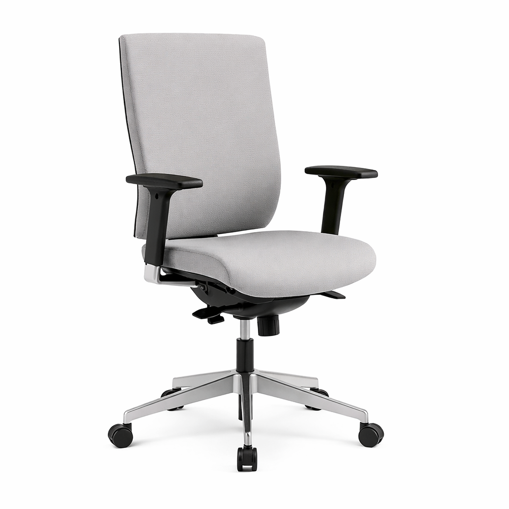 Kudos B‑H1 with upholstered adjustable back, sliding seat, aluminum adjustable arms, multi‑lock mechanism, and an aluminum five‑star base with castors.