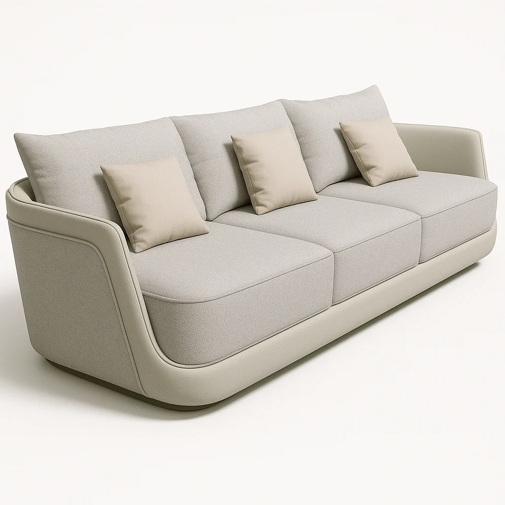 • Three-Seater: Spacious and elegant, this three-seater is upholstered in a combination of real leather and fabric, featuring soft cushions for extra comfort. The solid wooden frame ensures durability and support