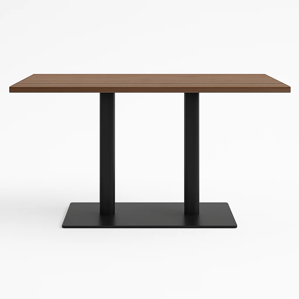 Meridian is a Customized Rectangular Dining Table – Measuring 140 x 70 x H75 cm, this table features a melamine top with a refined woodgrain finish, supported by a black powder-coated stainless-steel base. Designed for durability and modern elegance, it’s ideal for both residential and commercial interiors.