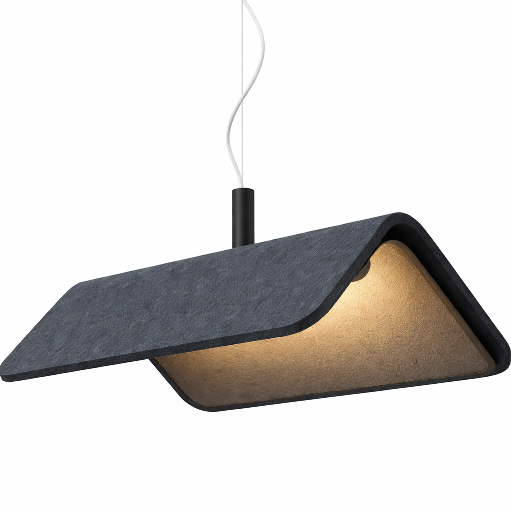 Roof is a contemporary LED pendant light that blends sculptural elegance with acoustic functionality. Its unique folded-loop design is crafted from molded acoustic felt panels in a deep navy hue, forming a soft rectangular enclosure that gently curves downward. This architectural form not only adds visual interest but also enhances sound absorption, making it ideal for acoustically sensitive environments.