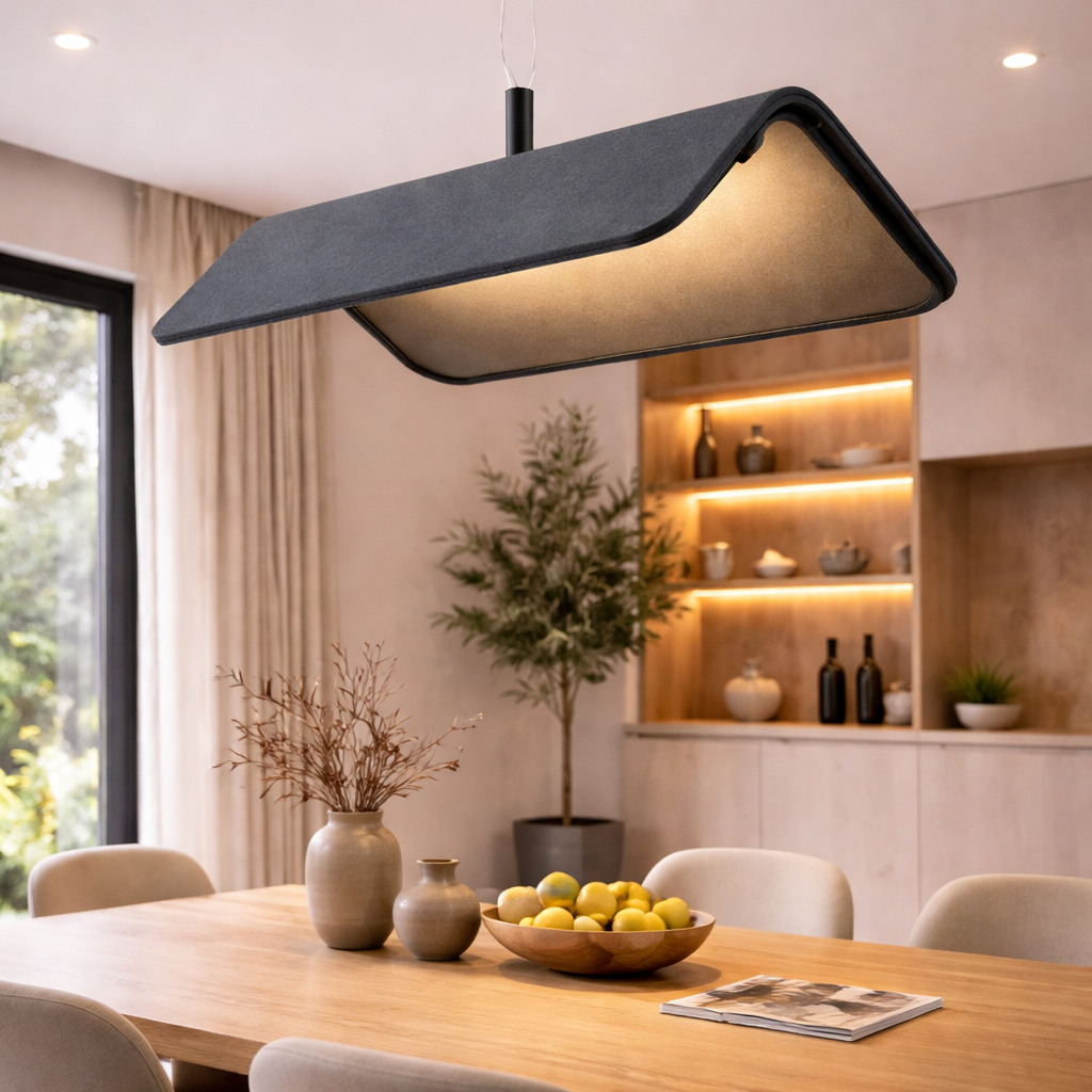 - Dual functionality: Combines acoustic comfort with ambient lighting in one cohesive fixture.