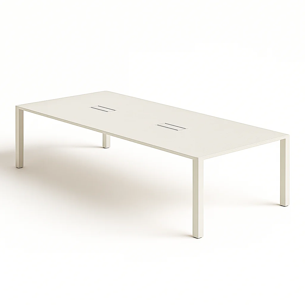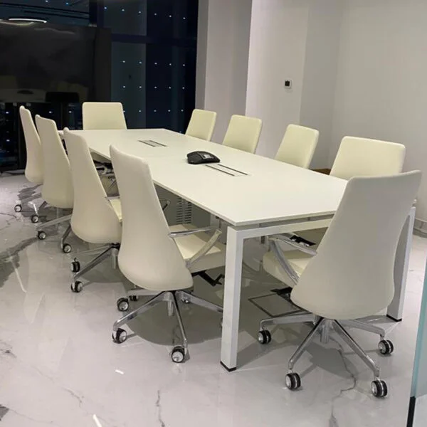 TENURE Meeting Table – 8 PAX and 16 PAX. The Tenure meeting table, designed for eight or 16 people, features a large melamine top, perfect for large group discussions. It is equipped with cable management solutions to keep wires organized. The table is supported by a sturdy steel powder-coated frame with four legs, ensuring a professional and polished look for conference rooms and meeting spaces.