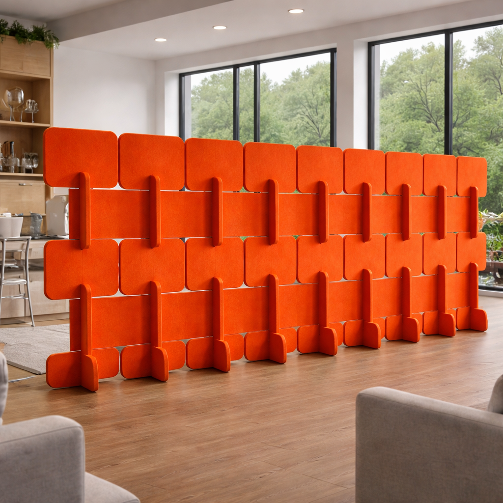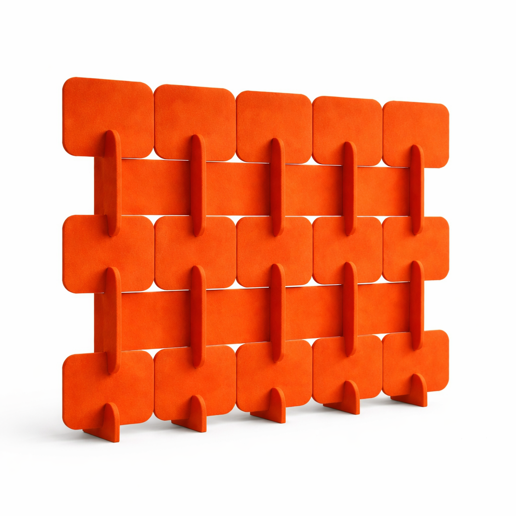 WEAVE is a modular, stand-free acoustic partition designed to define space while maintaining openness. Its interlocking panel construction creates a woven visual effect that softens interiors and improves acoustic comfort in shared environments. Manufactured from high-performance acoustic felt, Weave reduces ambient noise without the need for wall, floor, or ceiling fixings. The system is fully self-supporting, allowing layouts to be easily reconfigured as spaces evolve.